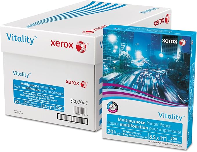 XEROX (3R02047) VITALITY HAS Superior high-performance FSC Certified paper. Suitable for all types of printers and copying equipment. This product delivers high-quality prints, even in large quantities without curling or jamming. Its opacity is ideal for double-sided printing. It also provides immediate ink absorption, which guarantees clear images, without flaws or smudges and with true colors.
